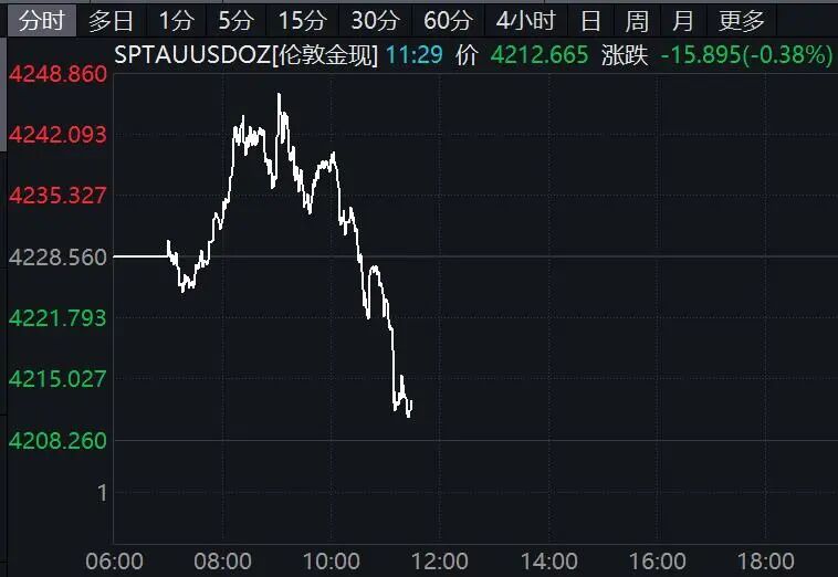 12月11日亚洲早盘国际金价一度走高,现货黄金站上4240美元/盎司,盘中突然跳水转为下跌,截至发稿,现货黄金报4212美元/盎司。纽约期金也回落收窄涨幅。