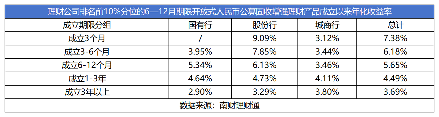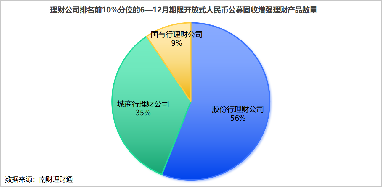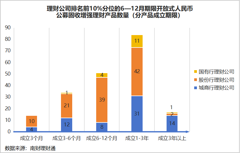 在理财公司排名前10%分位的6—12月期限开放式人民币公募固收增强理财产品中,股份行理财公司表现突出,共有112款产品上榜,占比超半数,在数量上保持领先地位。与此同时,城商行理财公司也表现出一定的竞争力,共计69款产品上榜。