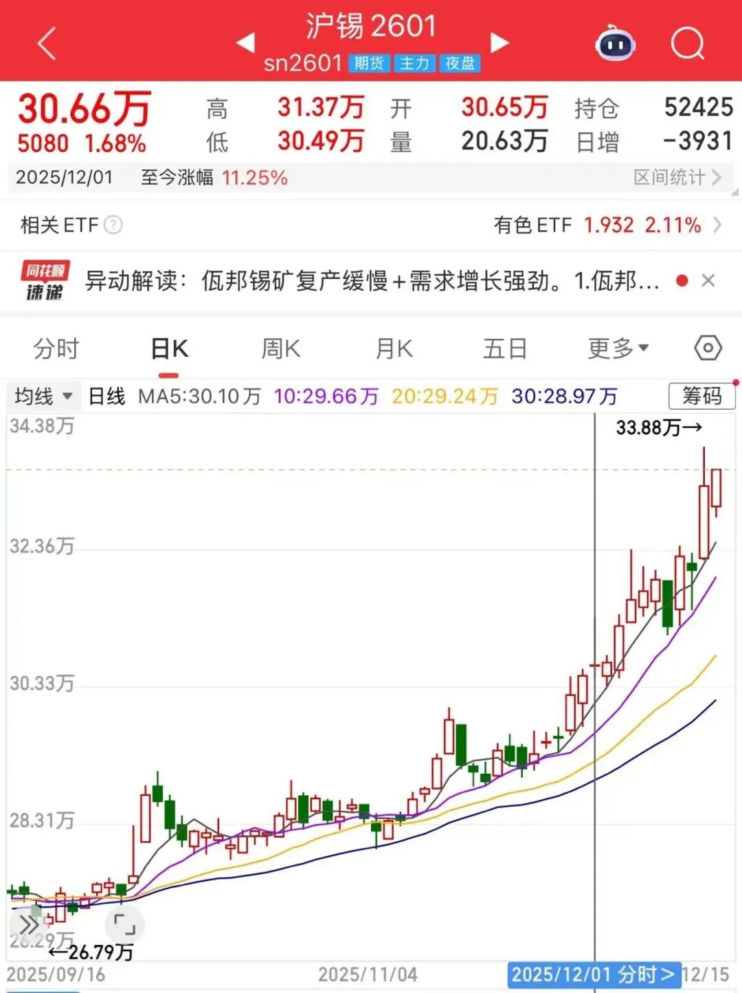 宏观层面同样传来利多消息。中信建投(601066)期货分析师虞璐彦表示,美国就业市场疲软明显提振了美联储降息预期,部分海外机构甚至预测明年1月美联储可能继续降息,叠加全球显性库存偏紧,沪锡期货价格中枢持续上移。