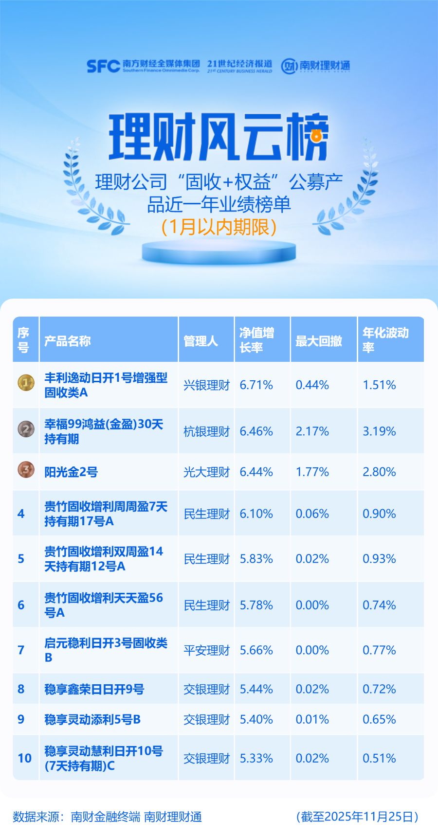 榜单数据说明:统计对象为理财公司发行的1月以内(含)投资周期的公募“固收+权益”产品,同系列同投资周期产品保留一只,统计区间为近1年,截止时间为2025年11月25日。理财产品数据来源于南财理财通(https://newgym.sfccn.com/)。榜单排名由理财通AI全自动化实时排名,如您对数据有疑问,请在文末联系助理进一步核实。