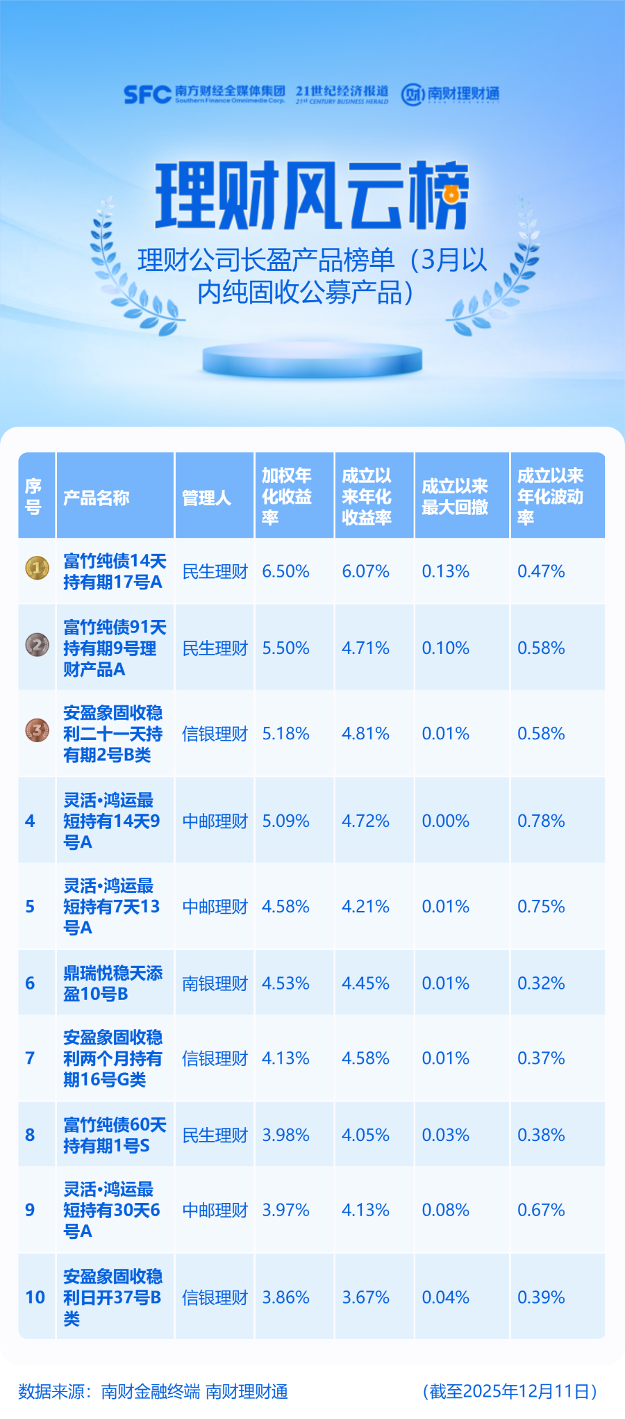 为更好地识别真正具备长期收益性的产品,剔除仅靠短期收益“打榜”、实则昙花一现的产品,南财理财通课题组特发布长盈榜单。本期榜单的所有纯固收产品成立时间均在1年以上,投资周期为3月以内(含),通过评估加权年化收益率(根据产品长短期表现加权计算得出的参考指标,更准确反映持有收益)为投资者优选出综合收益较高的理财产品。