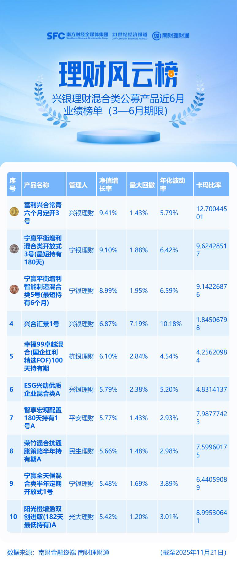 榜单数据说明:统计对象为理财公司发行的3-6个月(含)投资周期的公募混合类产品,同系列同投资周期产品保留一只,统计区间为近6月,截至时间为2025年11月21日。理财产品数据来源于南财理财通(https://newgym.sfccn.com/),股票数据来源于Wind。榜单排名由理财通AI全自动化实时排名,如您对数据有疑问,请在文末联系助理进一步核实。
