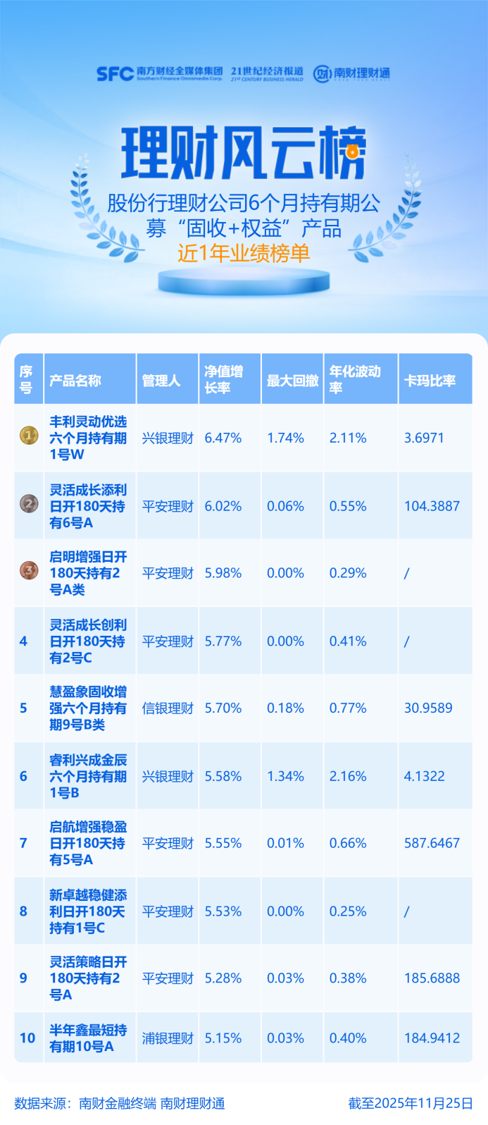 榜单数据说明:统计对象为股份行理财公司发行的6个月持有期的公募“固收+权益”产品,同系列同投资周期产品保留一只,统计区间为近1年,截至时间为2025年11月25日。理财产品数据来源于南财理财通(https://newgym.sfccn.com/)。榜单排名由理财通AI全自动化实时排名,如您对数据有疑问,请在文末联系助理进一步核实。