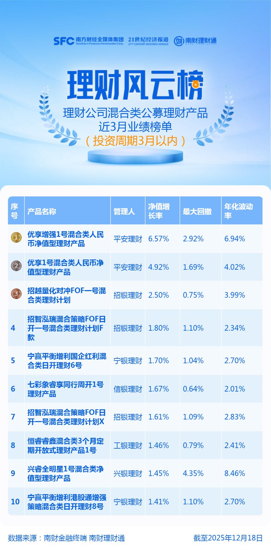 本期榜单中,平安理财包揽冠亚军。“优享增强1号混合类人民币净值型理财产品”和“优享1号混合类人民币净值型理财产品”依次位列榜单第一和第二,产品近3月净值增长率分别是6.57%和4.92%。招银理财“招越量化对冲FOF一号混合类理财计划”以2.50%的增长率位列第三。