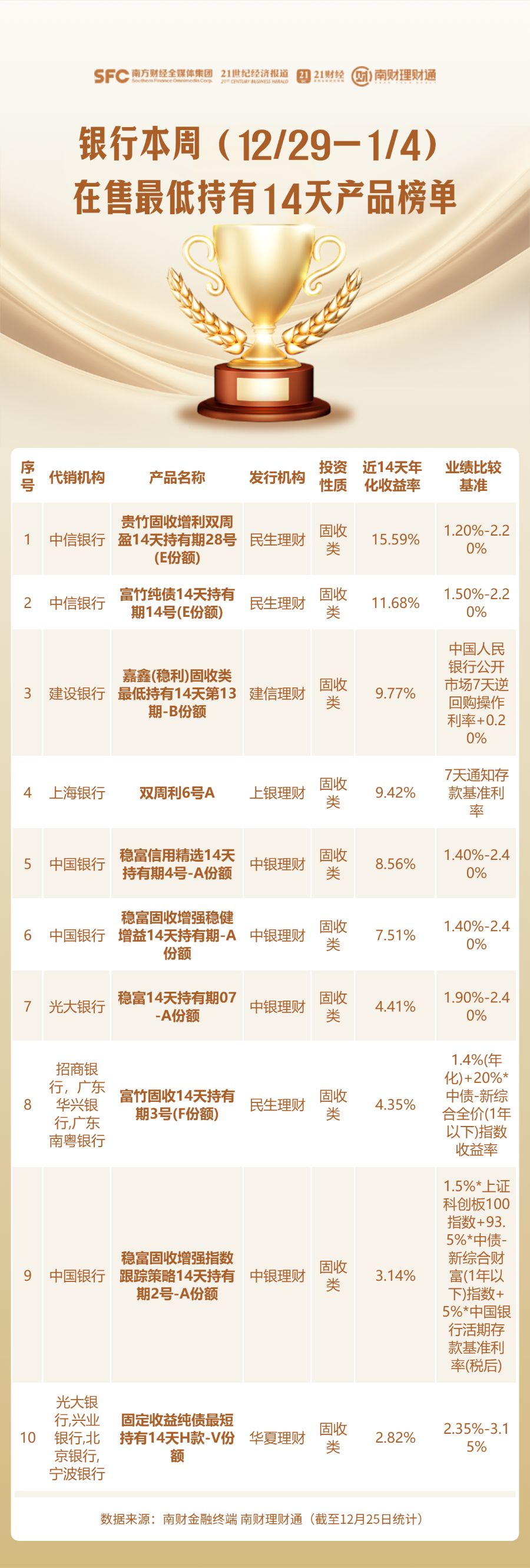 本期,南财理财通重点关注最低持有期人民币公募产品的业绩表现,按照7天、14天、30天、60天持有期限分类对产品业绩进行排名,业绩指标计算指标为年化收益率,计算区间与持有期限相同,如90天持有期产品的业绩计算区间为近三月年化收益率,同机构同系列同投资周期产品保留一只参与排名。