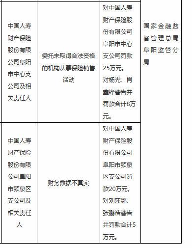人寿财险阜阳市中支被罚25万,颍泉区支公司被罚20万
