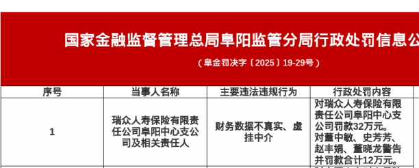 瑞众人寿阜阳中支被罚32万,涉财务数据不真实等