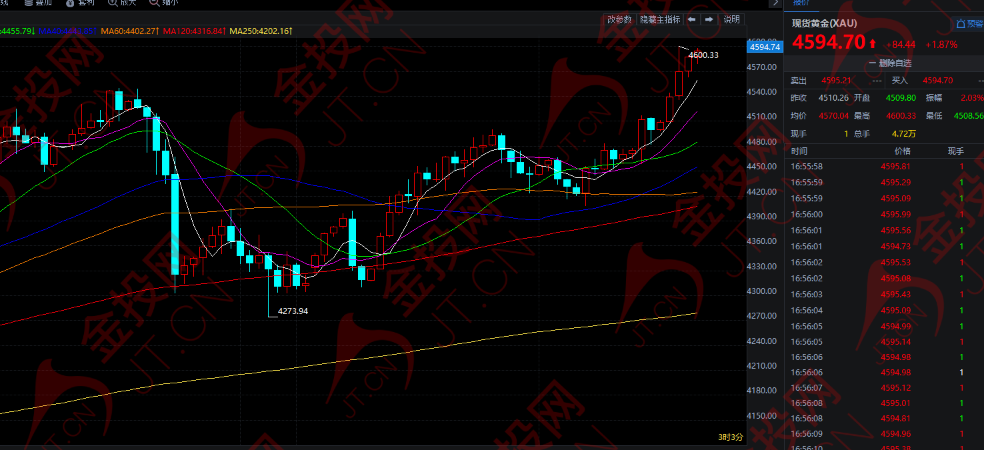 自2026年1月1日起,现货黄金一路冲高,在迅速冲破4400美元、4500美元、4550美元三个关口后,向上触及4600.33美元,再创历史新高。
