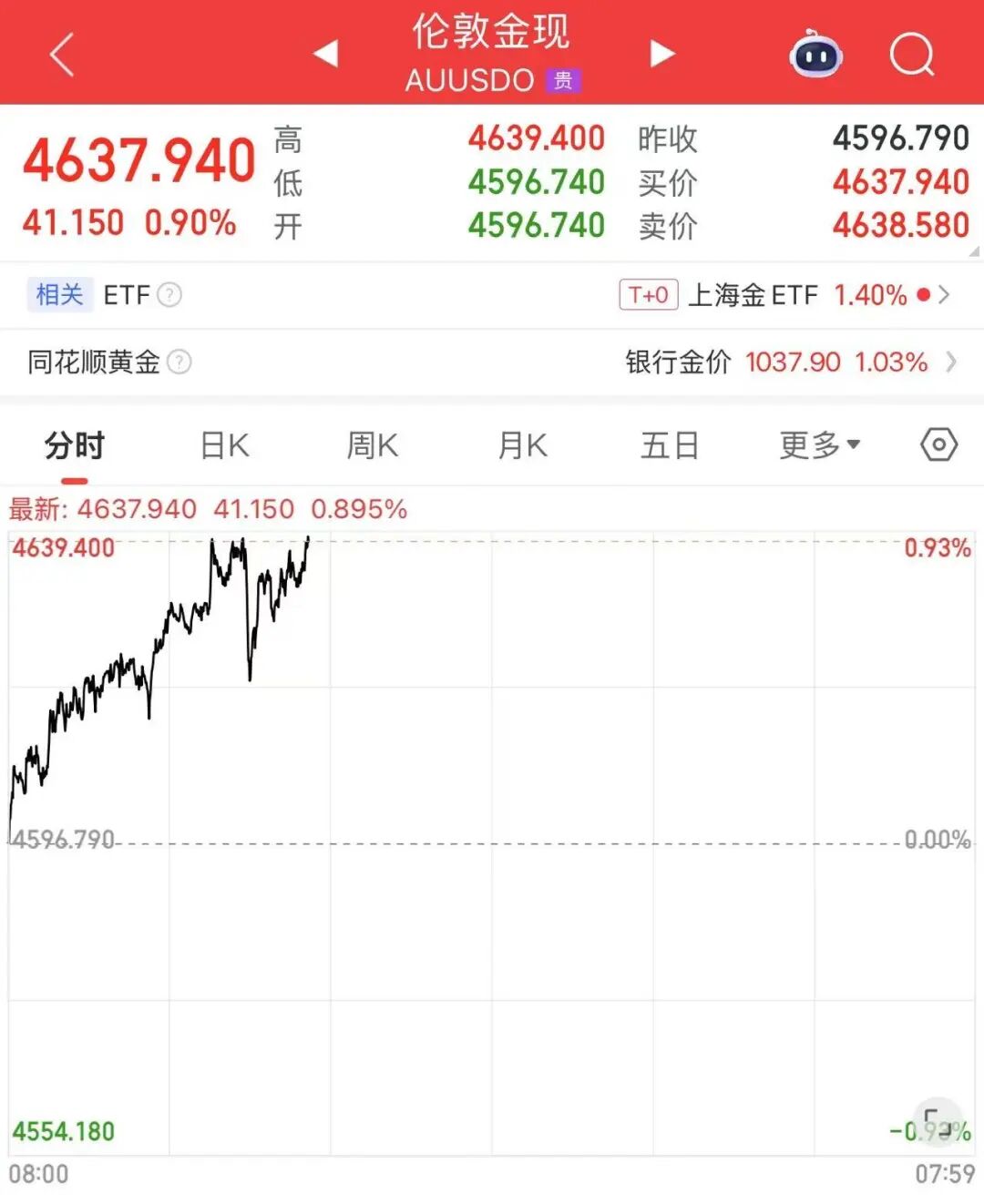 北京时间1月14日,现货黄金(伦敦金现)强势上涨,盘中又创历史新高。截至15时27分,伦敦金现上涨0.90%,日内最高涨至4639.40美元/盎司。
