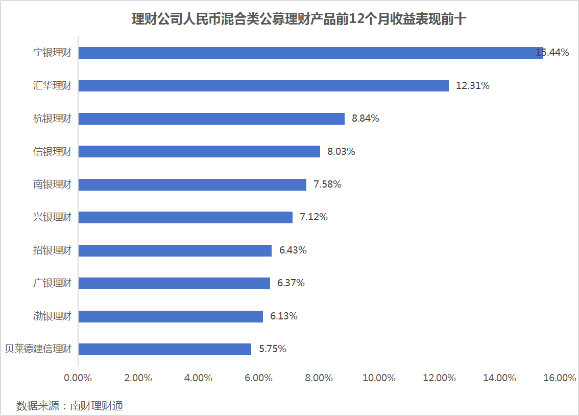 混合类理财产品表现上,宁银理财、汇华理财以及杭银理财的收益表现依旧领先。2025年平均净值增长率分别为15.44%、12.31%以及8.84%。
