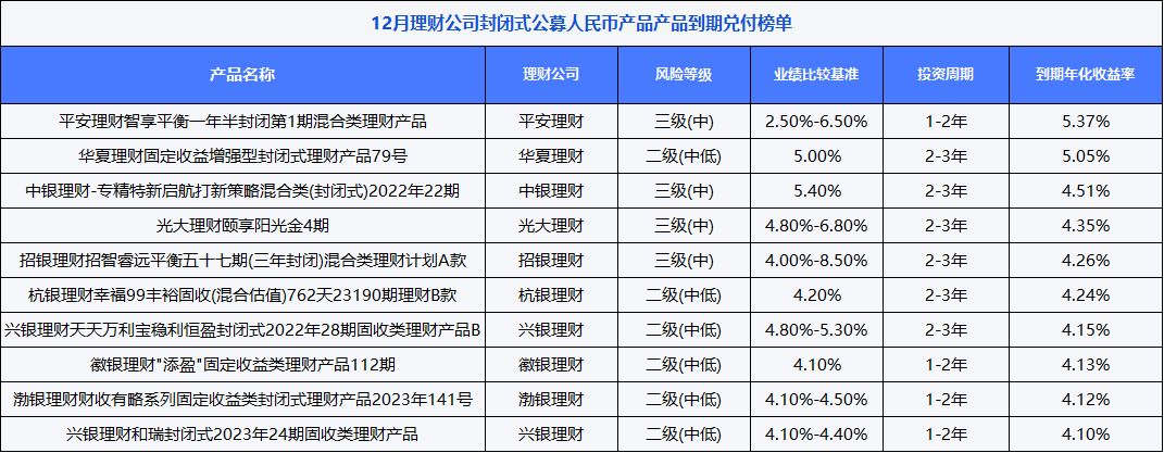 榜单:在12月理财公司封闭式公募理财到期兑付榜单中(注:同系列产品仅取一只,投资币种为人民币),9家理财公司产品上榜。平安理财“智享平衡一年半封闭第1期”和华夏理财“固定收益增强型封闭式理财产品79号”两只产品到期年化收益率超5%,位列前二。