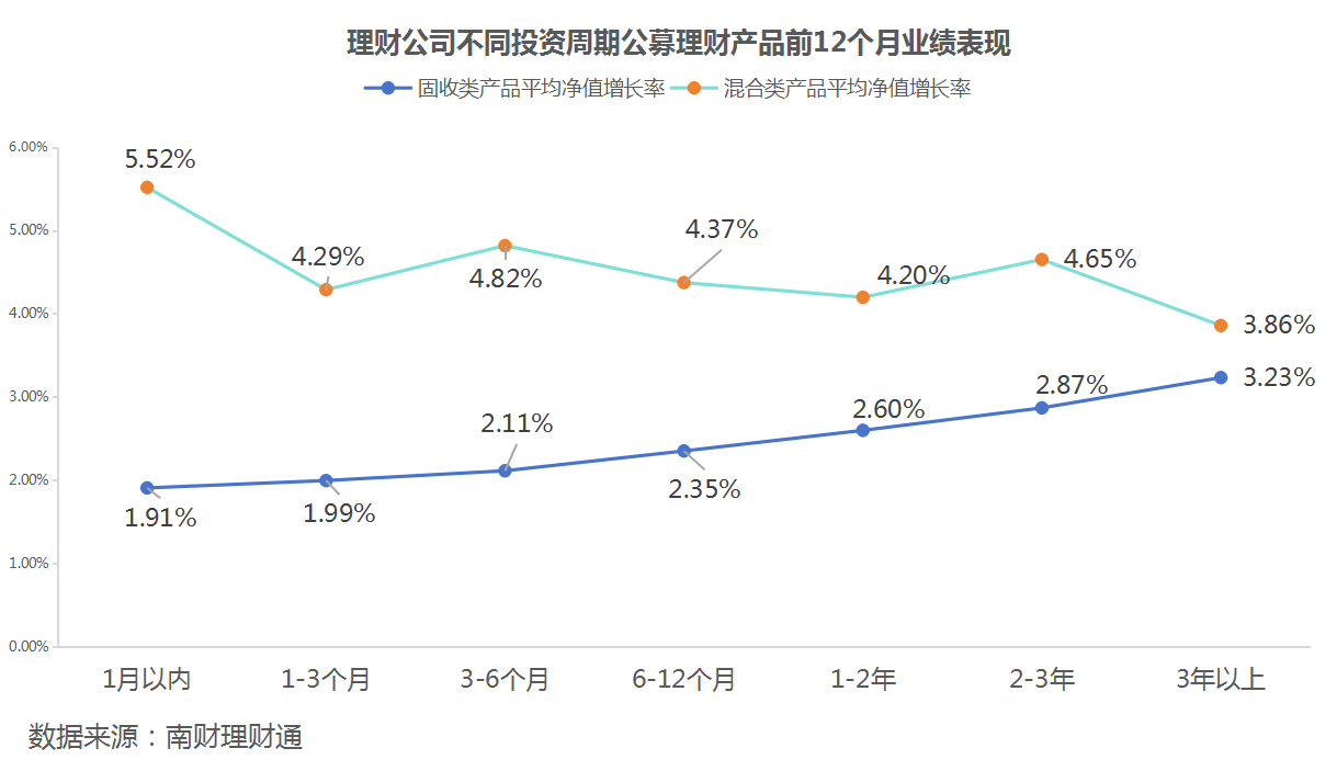 固定收益类产品中,1—2年期限产品到期年化收益率均值最高,为2.64%,其次是2—3年期限产品,为2.56%。