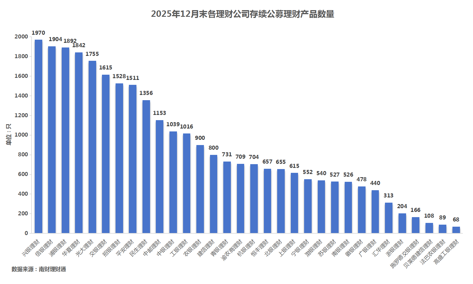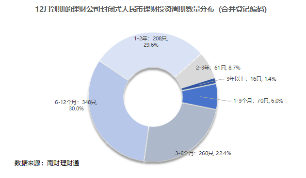 产品数量:据南财理财通数据,2025年12月,32家理财公司合计有1160只(按登记编码核算)封闭式人民币理财产品到期。分投资性质看,固收类、混合类、权益类分别有1093只、53只、12只产品到期,商品及金融衍生品类理财有2只到期。分募集方式看,公募型产品数量966只,私募型产品194只。信银理财、浦银理财、兴银理财到期产品数量位居前三。