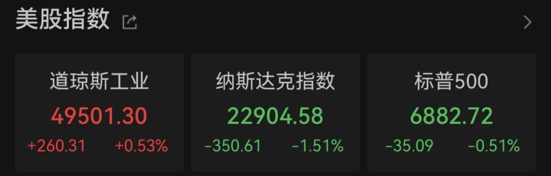 当地时间2月4日,美股三大指数收盘涨跌不一。数据显示,截至收盘,道琼斯工业指数涨260.31点,涨幅为0.53%;纳斯达克指数跌350.61点,跌幅为1.51%;标普500指数跌35.09点,跌幅为0.51%。
