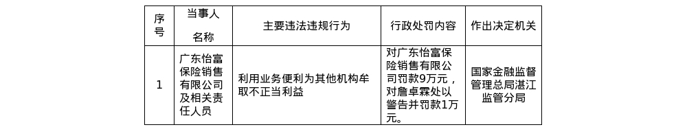 罚单显示,广东怡富保险销售有限公司的主要违法违规行为是:利用业务便利为其他机构牟取不正当利益。