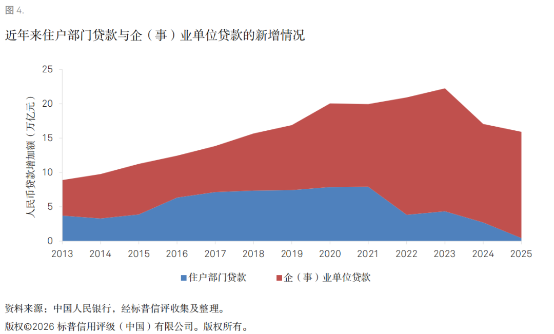 中小银行负债成本降幅不足以弥补资产端收益率下行对盈利的负面影响。一方面,贷款的定价水平持续下行,中小银行对信贷业务依赖较高,盈利韧性偏弱。自2019年8月LPR按新的形成机制计算以来,1年期LPR经历了12次下调、5年期以上LPR经历了11次下调,且均没有上调记录。另一方面,银行收紧了收益率相对较高的个人贷款投放,这主要是出于信用成本方面的考虑。2025年,国内人民币贷款增加额为16.27万亿元,其中住户部门贷款占比3%,较2021年下降约37个百分点,企(事)业单位贷款占比95%,较2021年上升约35个百分点(详见图4)。为应对资产端面临的收益压力,中小银行不断调降负债端的存款利率、优化存款期限结构以压降负债端的资金成本,但由于存款的重定价周期较贷款长,且银行业间同业竞争激烈,最终导致了净息差下降。
