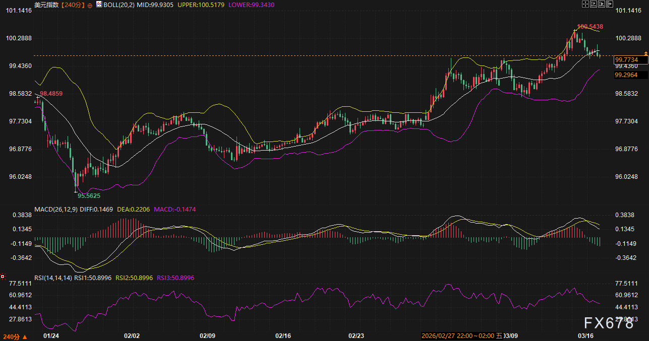 美元走势:美元指数240分钟线显示,价格已突破布林带上轨,且MACD红柱持续放大。尽管短线受获利盘影响回落至99.77附近,但只要10年期美债收益率守住4.05%—4.10%的关键支撑区间,美元的下行空间将非常有限。目前美元指数在100整数关口附近表现出较强的多头动能,市场正在消化美债收益率高位企稳带来的估值重修。