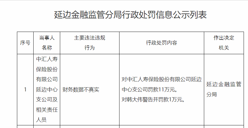 中汇人寿延边中心支公司财务数据造假,延边金融监管分局开出 11 万罚单,责任人韩大伟受罚