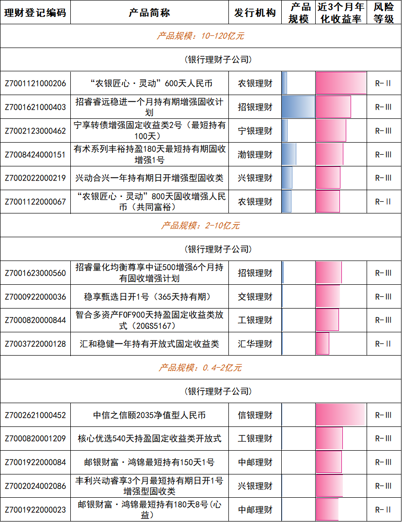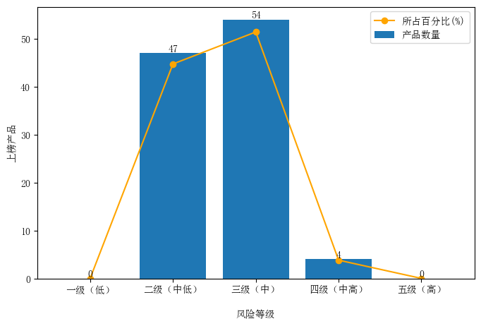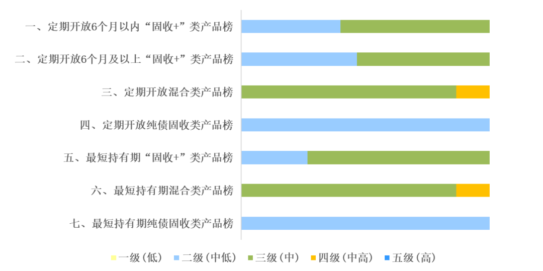 注:榜单中彩色条形长度代表数值大小,同组数值越大,条形长度越长。R-Ⅰ、R-Ⅱ、R-Ⅲ、R-Ⅳ、R-Ⅴ分别代表产品风险等级一级(低)、二级(中低)、三级(中)、四级(中高)、五级(高)。