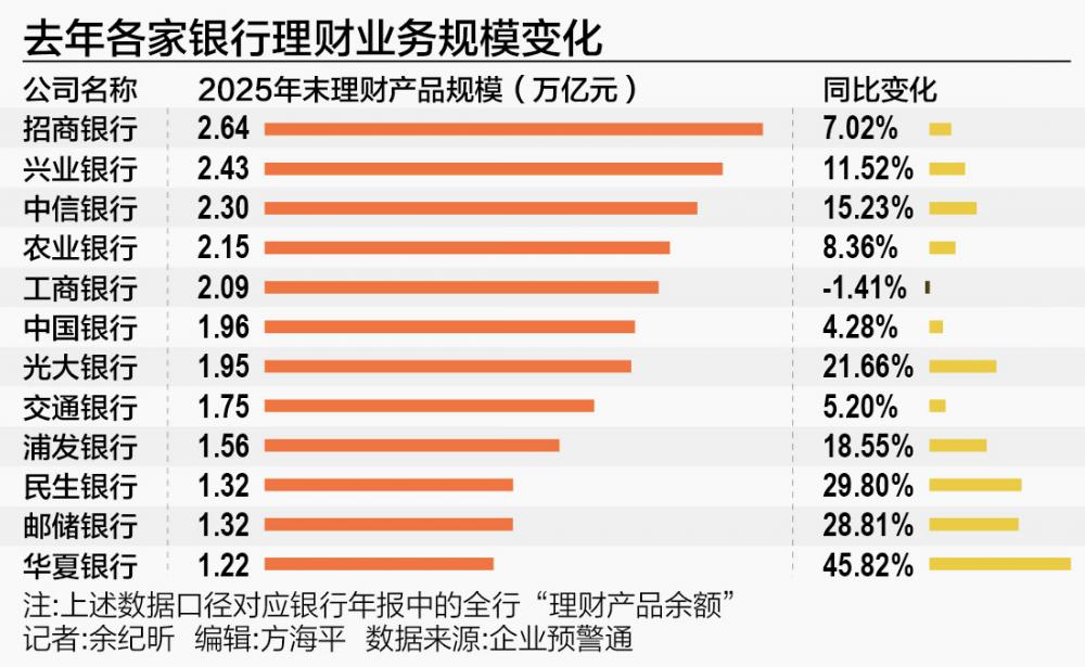 全行理财业务规模方面,2025年末,招商银行以26437.50亿元的理财规模稳居市场首位,成为理财业务首家站上2.6万亿关口的银行。兴业、中信、农行、工行、中行、光大、交行、浦发、民生、邮储等银行的理财规模去年也保持在万亿级别,合计与招行共同构成了13家的稳固头部阵营。