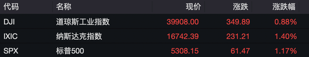 当地时间5月15日周三,美股三大股指全线收涨。道指涨349.89点,涨幅为0.88%,报39908.00点;纳指涨231.21点,涨幅为1.40%,报16742.39点;标普500指数涨61.47点,涨幅为1.17%,报5308.15点。